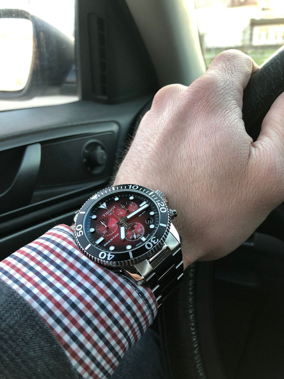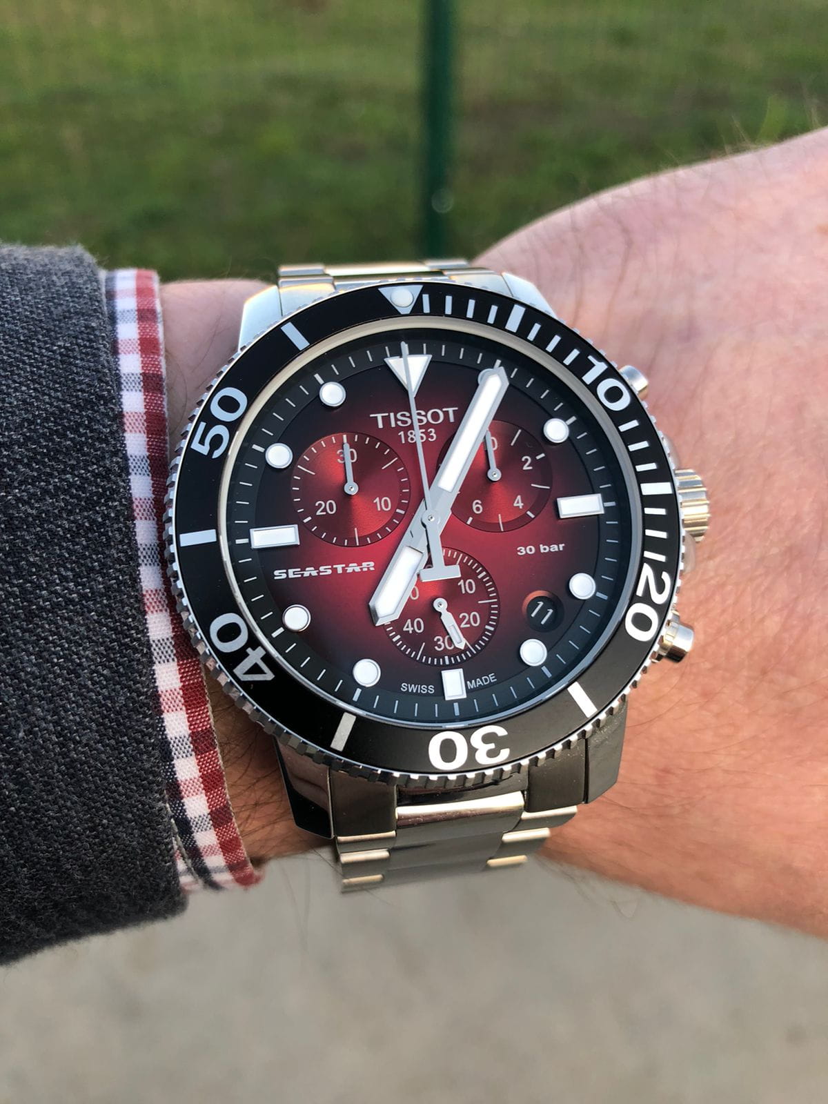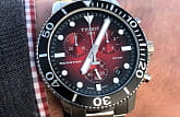 На фоне серебристого браслета и темного безеляБезельВнешний ободок, закрепляющий стекло. В спортивных часах так называется поворотное кольцо с делениями на циферблате, выполняет роль таймера – замеряет отрезки времени на шкале. Неподвижный безель – элемент декора. Однонаправленно вращающийся безель на дайверских часах позволяет фиксировать моменты погружения и выныривания на поверхность. ярко выделяется красный циферблат, отлично видны серебристые стрелки и часовые метки с люминесцентным покрытиемЛюминесцентное покрытиеПозволяет считывать показания времени в темноте. Производители наносят на стрелки, часовые индексы, безель или поверхность циферблата светонакопительный состав, дающий холодное свечение.. Завинчивающиеся кнопки, головка, прозрачная задняя крышка. Сапфировое стекло. Апертура даты. Габариты: 43 x 43 x 12,7 мм.