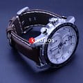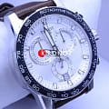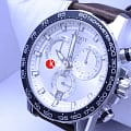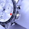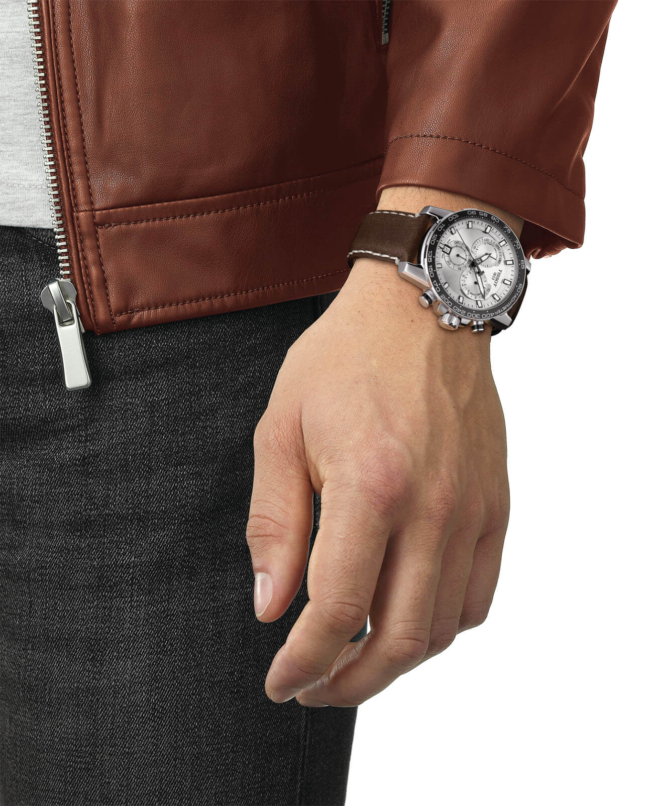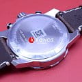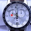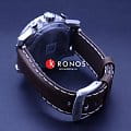 Аксессуар позволит грамотно дополнить образ, гармония холодной серебристой палитры никогда не потеряет актуальности. Наручные часы позволят всегда находиться в центре внимания. Массивный циферблат с крупной индикацией времени, симметричным расположением окошек – важная деталь для делового мужчины, привыкшего всё делать вовремя. Ремешок из тисненой натуральной кожи имеет белую прострочку, вдохновение идет от спортивных моделей. Швейцарский кварцевый механизм ETA G10.212. Сапфировое стекло. Корпус из нержавеющей стали 316L. БезельБезельВнешний ободок, закрепляющий стекло. В спортивных часах так называется поворотное кольцо с делениями на циферблате, выполняет роль таймера – замеряет отрезки времени на шкале. Неподвижный безель – элемент декора. Однонаправленно вращающийся безель на дайверских часах позволяет фиксировать моменты погружения и выныривания на поверхность. размечен шкалой тахиметраТахиметрРазмеченная шкала, располагается на ободке или безеле часов. Тахиметр позволяет рассчитать скорость на определённом участке пути, расстояние измеряется в километрах или милях.. Водонепроницаемость до 10 бар. Люминесцентная подсветкаЛюминесцентное покрытиеПозволяет считывать показания времени в темноте. Производители наносят на стрелки, часовые индексы, безель или поверхность циферблата светонакопительный состав, дающий холодное свечение.. Секундомер, хронографХронографФункция позволяет измерять отрезки времени с особой точностью: часы, минуты, секунды. Верным признаком хронографа является наличие на циферблате 3 дополнительных окошек-счётчиков., индикация числа. Диаметр корпуса: 45,5 мм.