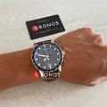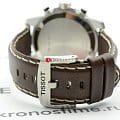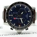 Массивный стальной корпус привлекает брутальными, характерными деталями. Это идеальный вариант для мужчины, желающего всегда быть в центре внимания. Ярко-синий циферблат в окружении чёрного безеляБезельВнешний ободок, закрепляющий стекло. В спортивных часах так называется поворотное кольцо с делениями на циферблате, выполняет роль таймера – замеряет отрезки времени на шкале. Неподвижный безель – элемент декора. Однонаправленно вращающийся безель на дайверских часах позволяет фиксировать моменты погружения и выныривания на поверхность. со шкалой тахиметраТахиметрРазмеченная шкала, располагается на ободке или безеле часов. Тахиметр позволяет рассчитать скорость на определённом участке пути, расстояние измеряется в километрах или милях. – беспроигрышное сочетание. Ремешок из натуральной кожи с крупной белой прострочкой является элементом из спортивного мира. Динамичный хронографХронографФункция позволяет измерять отрезки времени с особой точностью: часы, минуты, секунды. Верным признаком хронографа является наличие на циферблате 3 дополнительных окошек-счётчиков. измеряет время с абсолютной точностью хода благодаря швейцарскому кварцевому механизму ETA G10.212. Сапфировое стекло устойчиво к царапинам. Стрелки и индексы дополнены люминесцентным покрытиемЛюминесцентное покрытиеПозволяет считывать показания времени в темноте. Производители наносят на стрелки, часовые индексы, безель или поверхность циферблата светонакопительный состав, дающий холодное свечение.. Среди функций: секундомер, отображение даты. Высокая водонепроницаемость – до 100 метров. Диаметр корпуса: 45,5 мм.