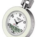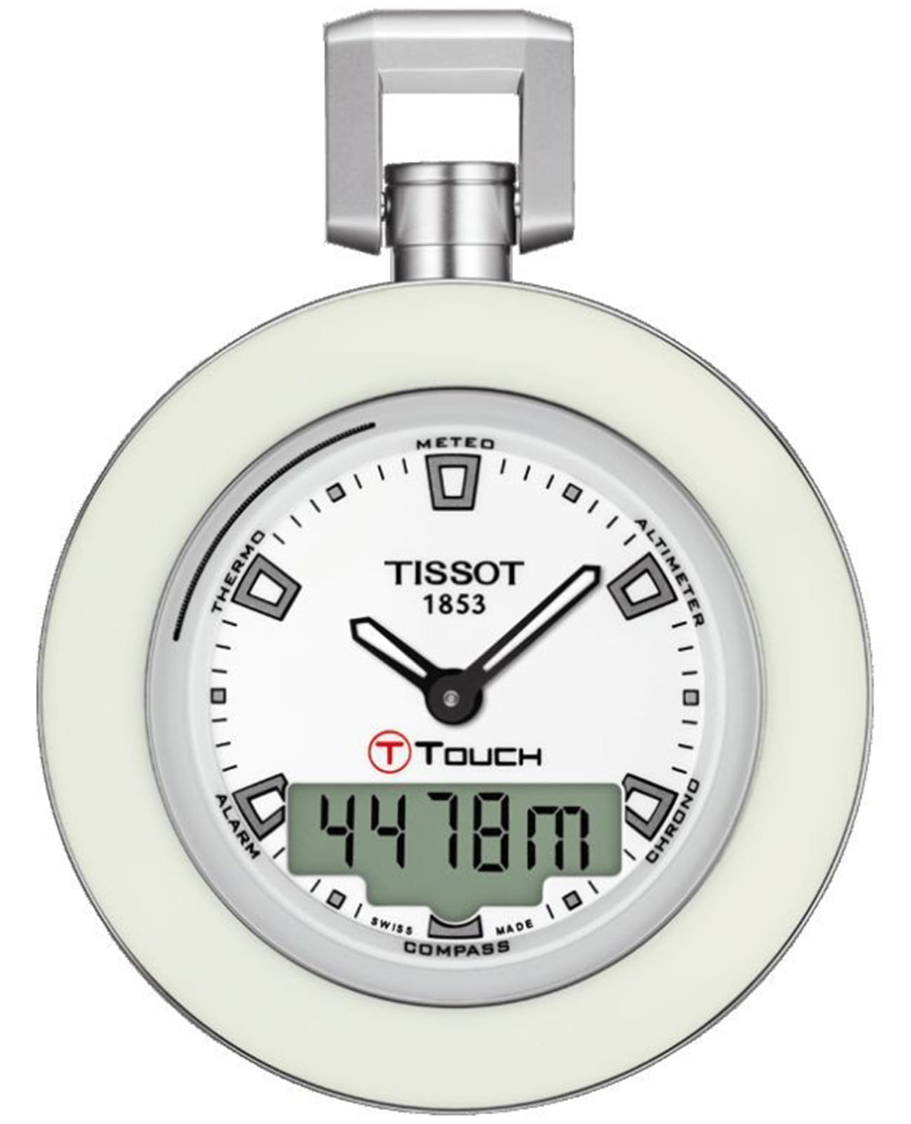 Tissot T-Pocket Touch T857.420.19.011.00 — это многофункциональные карманные часы. Модель состоит из серебристо-бежевой нержавеющей стали и белого циферблата, защищенного сапфировым стекломСапфировое стеклоПрочный и надёжный материал из кристалла сапфира синтетического происхождения, характеризующийся особой твёрдостью и устойчивостью к царапинам и повреждениям., на котором расположен дисплей. Через него можно использовать будильникБудильникБуди́льник — часы, в заданный момент времени подающие звуковой, световой и/или в редких случаях другой сигнал., GMTGMTОтображение времени второго часового пояса.Такая функция особенно актуальна для путешественников и бизнесменов,которые общаются с людьми из разных стран,теперь вы всегда будете знать,какой час у вашего партнёра или близкого человека., барометр, второй часовой поясВторой часовой поясФункция, позволяющая отображать время двух часовых поясов одновременно., термометр, высотомер, секундомерСекундомерСекундоме́р — прибор, способный измерять интервалы времени с точностью до долей секунды., хронографХронографФункция позволяет измерять отрезки времени с особой точностью: часы, минуты, секунды. Верным признаком хронографа является наличие на циферблате 3 дополнительных окошек-счётчиков., шагомерШагомерШагоме́р или педо́метр — измерительный прибор для подсчёта количества сделанных шагов (или пар шагов) при ходьбе или беге., вечный календарьВечный календарьКлассическое часовое усложнение, представляющее собой календарь, рассчитанный на несколько лет вперёд (стандартно – до 2099 года). Определяет текущую дату, день недели, месяц., мировое времяМировое время Полезное часовое усложнение, отображающее время в основных городах и известных областях по всему миру, оно связано с часовыми поясами, удобно для путешественников и бизнесменов. . БезельБезельВнешний ободок, закрепляющий стекло. В спортивных часах так называется поворотное кольцо с делениями на циферблате, выполняет роль таймера – замеряет отрезки времени на шкале. Неподвижный безель – элемент декора. Однонаправленно вращающийся безель на дайверских часах позволяет фиксировать моменты погружения и выныривания на поверхность. с PVD-покрытиемPVDУльтратонкое покрытие наносится в технике вакуумного напыления, сочетает в себе нитрид титана особой прочности со слоем золота или оксида хрома. Несёт в себе декоративную или защитную функцию.. Класс водозащиты: 100 метров, позволит плавать, нырять и заниматься другими водными видами спорта. Часы имеют EOLEOLПредставляет собой систему, уведомляющую владельца часов о необходимости замены элемента питания. За 2 недели до полного разряда батарейки секундная стрелка перестаёт ходить чётко и начинает перепрыгивать на 3-4 деления.. Стрелки и метки с люминесцентным покрытиемЛюминесцентное покрытиеПозволяет считывать показания времени в темноте. Производители наносят на стрелки, часовые индексы, безель или поверхность циферблата светонакопительный состав, дающий холодное свечение..