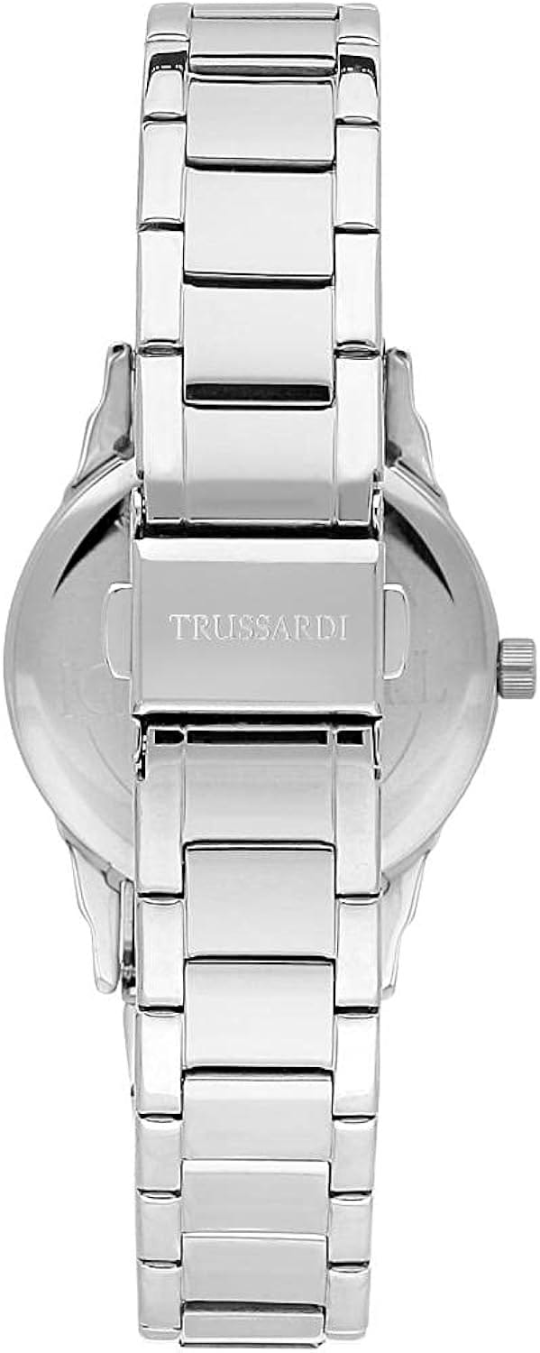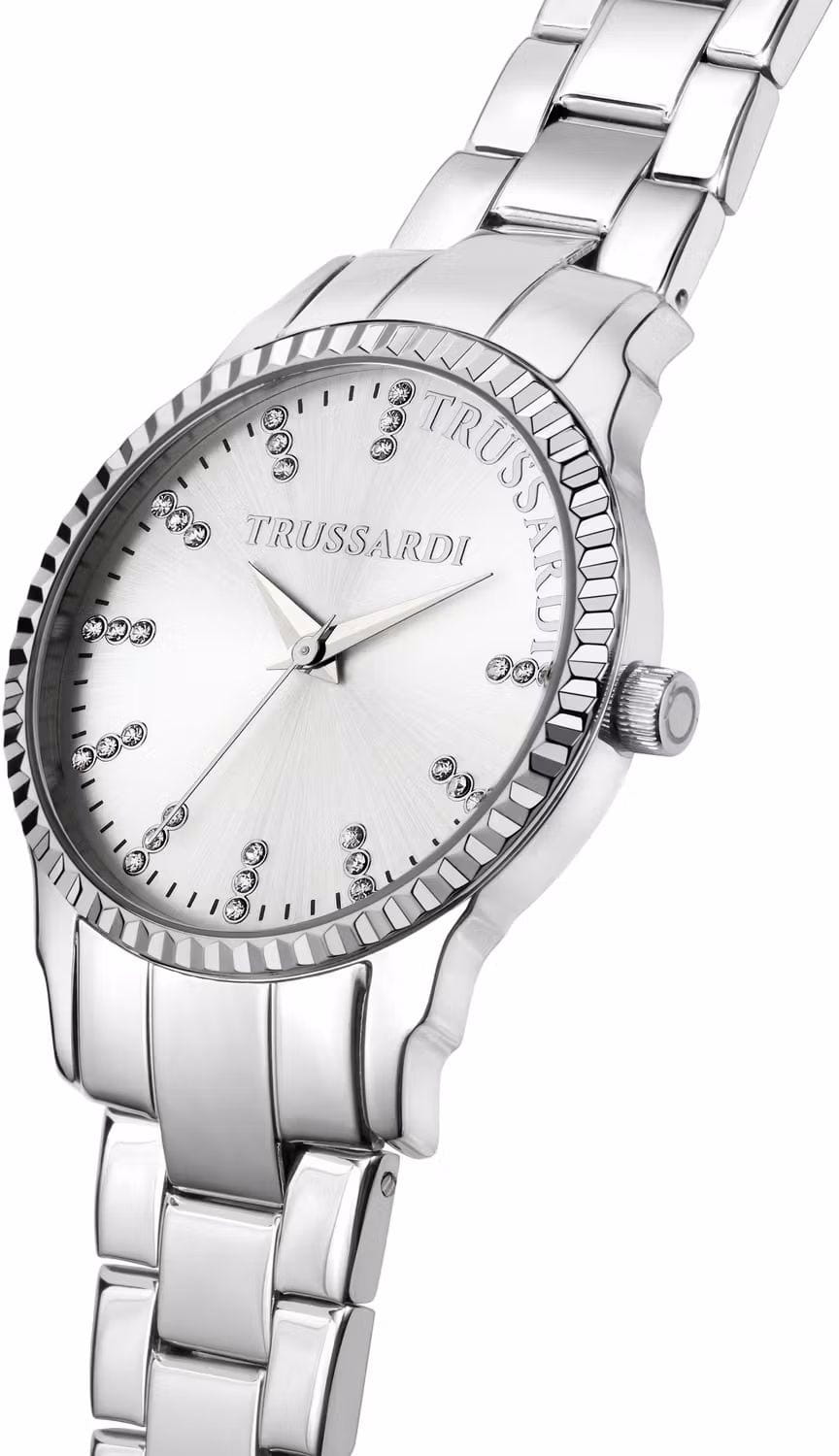 Итальянские женские часы Trussardi T-Bent R2453141504 - это стильный женский аксессуар, который сочетает элегантный дизайн и практичность. Корпус выполнен из нержавеющей стали, что обеспечивает долговечность и утончённый внешний вид. Надежное минеральное стеклоМинеральное стеклоМинеральное стекло представляет собой искусственно выращенный минерал кварца. Такое стекло отличается особой устойчивостью к повреждениям и царапинам. Уступает по некоторым качествам сапфировому стеклу. защищает циферблат с кристаллами от царапин и обеспечивает долговечность. Модель оснащена кварцевым механизмом, обеспечивающим высокую точность хода. Браслет из нержавеющей стали на раскладной застёжкеРаскладная застёжкаТакой тип застёжки используется только на браслетах из металла. Она никогда не раскрывается полностью, происходит разделение на 2 и более частей. Раскладывающая застёжка снизит вероятность потери часов к минимуму. обеспечивает комфортное ношение. Водозащита 50 метров позволит защитить корпус от случайных брызг или капель дождя. Эта модель – отличный выбор для тех, кто ищет сочетание стиля, качества и функциональности. Часы станут не только полезным аксессуаром, но и выразительным элементом вашего имиджа.