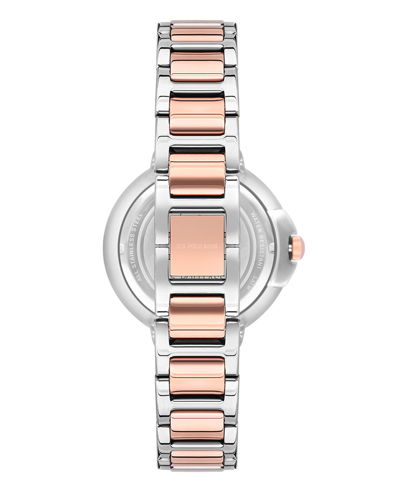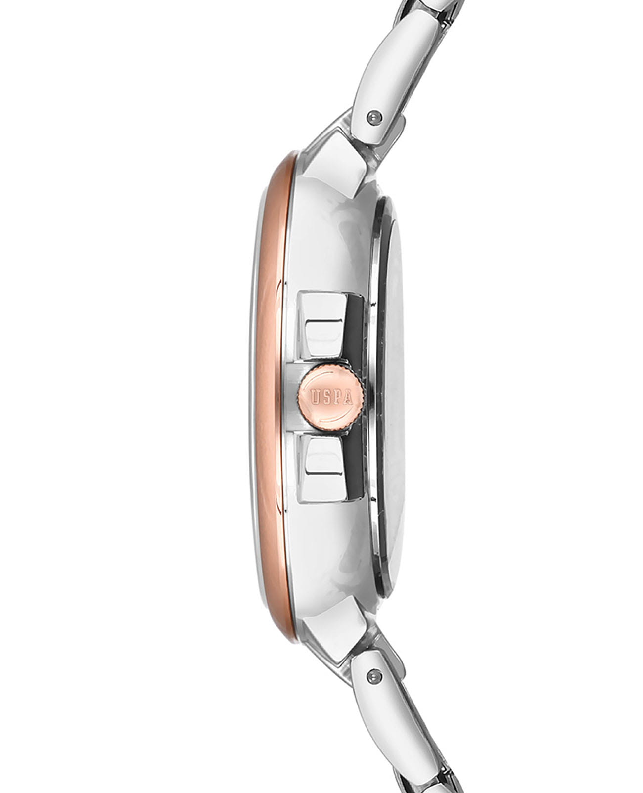 Женские часы U.S. Polo Assn Stile USPA2012-04 кварцевый механизм с высокой точностью. Минеральное стеклоМинеральное стеклоМинеральное стекло представляет собой искусственно выращенный минерал кварца. Такое стекло отличается особой устойчивостью к повреждениям и царапинам. Уступает по некоторым качествам сапфировому стеклу. устойчивое к появлению царапин, обладающее высокой прозрачностью. Корпус часов изготовлен из нержавеющей стали. БезельБезельВнешний ободок, закрепляющий стекло. В спортивных часах так называется поворотное кольцо с делениями на циферблате, выполняет роль таймера – замеряет отрезки времени на шкале. Неподвижный безель – элемент декора. Однонаправленно вращающийся безель на дайверских часах позволяет фиксировать моменты погружения и выныривания на поверхность. с IP-покрытиемIP-покрытиеМетод ионного напыления. Демонстрирует повышенную устойчивость к истиранию, окислению и химическим веществам. Под воздействием высокого давления и температуры около 1500°C молекулы металла надёжно соединяются с частицами корпуса часов.. Циферблат украшен кристаллами. Окошко даты находится в положении 6 часов. Класс водозащиты: 50 метров, позволит защитить корпус от случайных брызг или капель дождя. Стальной браслет с частичным IP-покрытиемIP-покрытиеМетод ионного напыления. Демонстрирует повышенную устойчивость к истиранию, окислению и химическим веществам. Под воздействием высокого давления и температуры около 1500°C молекулы металла надёжно соединяются с частицами корпуса часов. на ювелирной застежке.