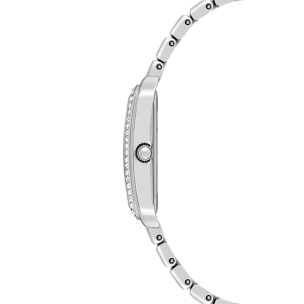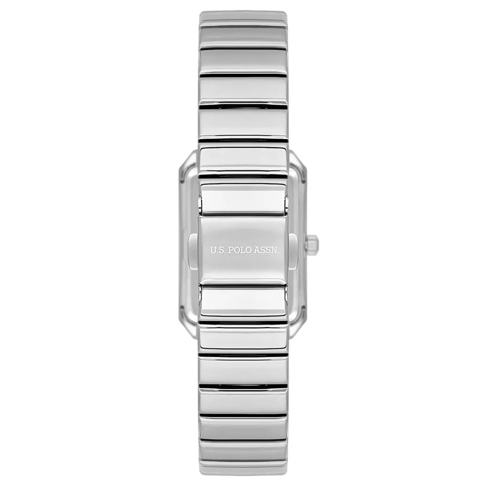 Женские наручные часы U.S. Polo Assn. Stile USPA2108-02 — это стильный и лаконичный аксессуар, выполненный в форме квадрата. Модель изготовлена из стали серебристого цвета, а безельБезельВнешний ободок, закрепляющий стекло. В спортивных часах так называется поворотное кольцо с делениями на циферблате, выполняет роль таймера – замеряет отрезки времени на шкале. Неподвижный безель – элемент декора. Однонаправленно вращающийся безель на дайверских часах позволяет фиксировать моменты погружения и выныривания на поверхность. украшен изысканными кристаллами, придающими часам роскошный вид. Циферблат с лаконичными центральными часовой и минутной стрелками. Защиту циферблата обеспечивает минеральное стеклоМинеральное стеклоМинеральное стекло представляет собой искусственно выращенный минерал кварца. Такое стекло отличается особой устойчивостью к повреждениям и царапинам. Уступает по некоторым качествам сапфировому стеклу., устойчивое к мелким повреждениям. Часы оснащены кварцевым механизмом, гарантирующим точность и минимальное обслуживание. Водонепроницаемость 3 АТМ позволяет использовать часы в повседневных условиях — при мытье рук или под лёгким дождём. Браслет выполнен из стали и оснащён раскладной застёжкойРаскладная застёжкаТакой тип застёжки используется только на браслетах из металла. Она никогда не раскрывается полностью, происходит разделение на 2 и более частей. Раскладывающая застёжка снизит вероятность потери часов к минимуму., обеспечивающей комфорт и уверенную фиксацию на запястье. Толщина корпуса составляет 8 мм, а его размер 23 мм, что делает часы компактными и удобными в носке. Эти часы станут универсальным аксессуаром для уверенных в себе женщин, которые ценят сочетание стиля, качества и эстетики — идеальный выбор для повседневного образа и торжественных случаев.
