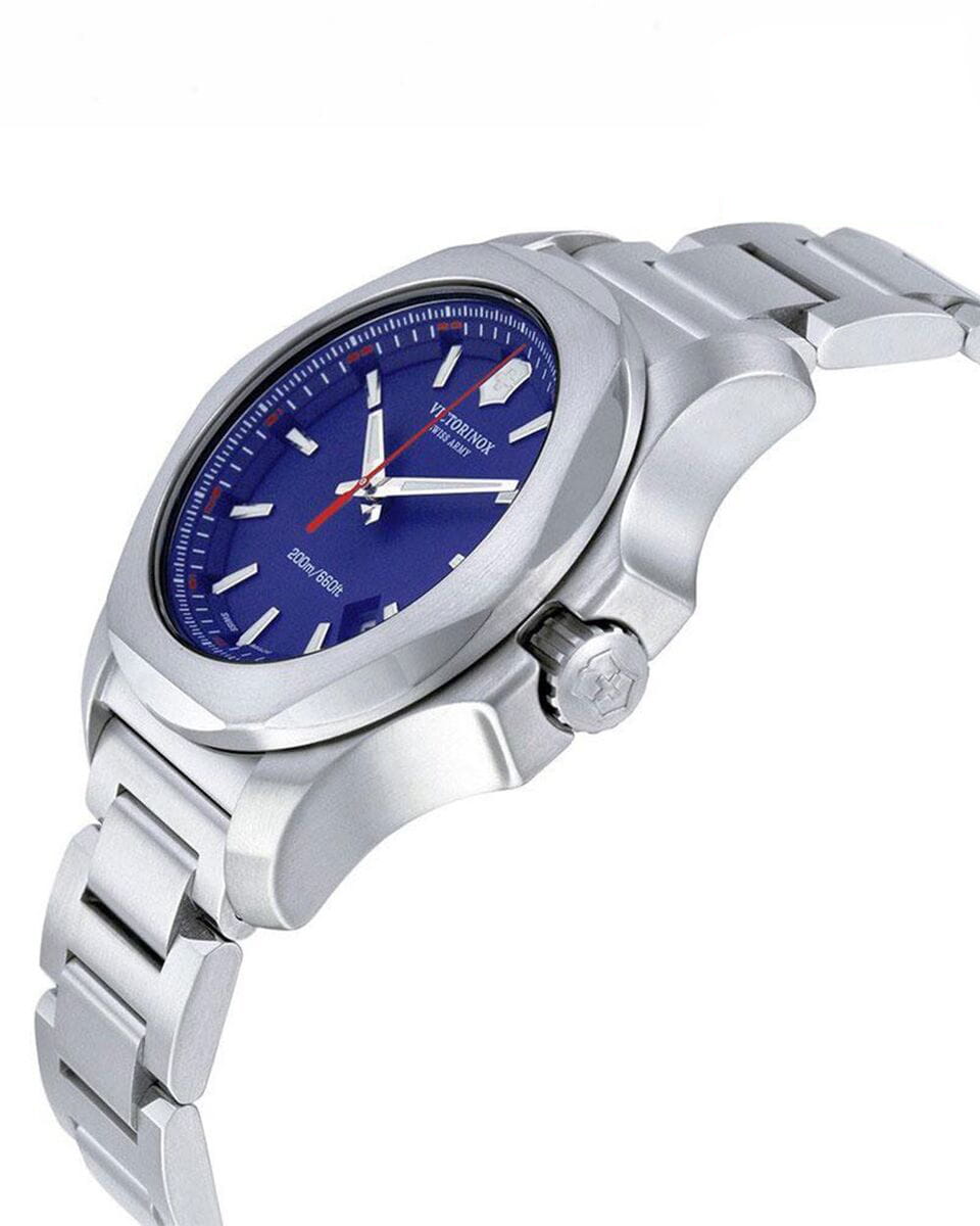 Мужские швейцарские часы Victorinox I.N.O.X. 241724.1. Сапфировое стеклоСапфировое стеклоПрочный и надёжный материал из кристалла сапфира синтетического происхождения, характеризующийся особой твёрдостью и устойчивостью к царапинам и повреждениям. с трёхслойным антибликовым покрытием. Корпус часов выполнен из нержавеющей стали 316L. Стальной браслет на раскладной застёжкеРаскладная застёжкаТакой тип застёжки используется только на браслетах из металла. Она никогда не раскрывается полностью, происходит разделение на 2 и более частей. Раскладывающая застёжка снизит вероятность потери часов к минимуму.. Влагозащита: 200 метров, позволит плавать, нырять и заниматься другими водными видами спорта. Окошко даты находится в положении между 4 и 5 часов. Стрелки и метки с люминесцентным покрытиемЛюминесцентное покрытиеПозволяет считывать показания времени в темноте. Производители наносят на стрелки, часовые индексы, безель или поверхность циферблата светонакопительный состав, дающий холодное свечение..