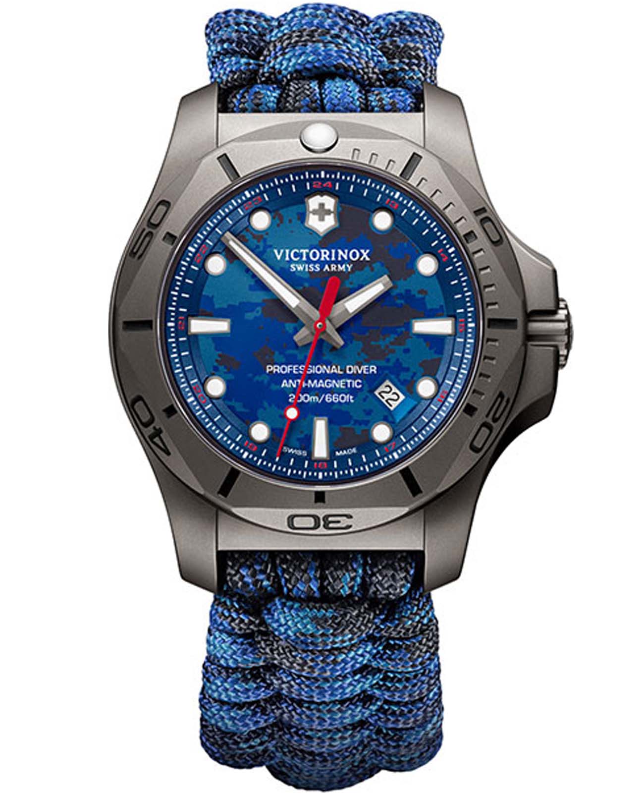 Мужские швейцарские часы Victorinox I.N.O.X. 241813.2. Сапфировое стеклоСапфировое стеклоПрочный и надёжный материал из кристалла сапфира синтетического происхождения, характеризующийся особой твёрдостью и устойчивостью к царапинам и повреждениям. с трёхслойным антибликовым покрытием. Корпус часов выполнен из нержавеющей стали 316L. Ремешок изготовлен из плетенной паракордовой стропы, длиной 2,5 метра и способной выдержать 250 кг. Влагозащита: 200 метров, позволит плавать, нырять и заниматься другими водными видами спорта. Окошко даты находится в положении между 4 и 5 часов. Стрелки и метки с люминесцентным покрытиемЛюминесцентное покрытиеПозволяет считывать показания времени в темноте. Производители наносят на стрелки, часовые индексы, безель или поверхность циферблата светонакопительный состав, дающий холодное свечение.. В комплекте съемный защитный бампер с увеличительным стеклом и резиновый ремешок.