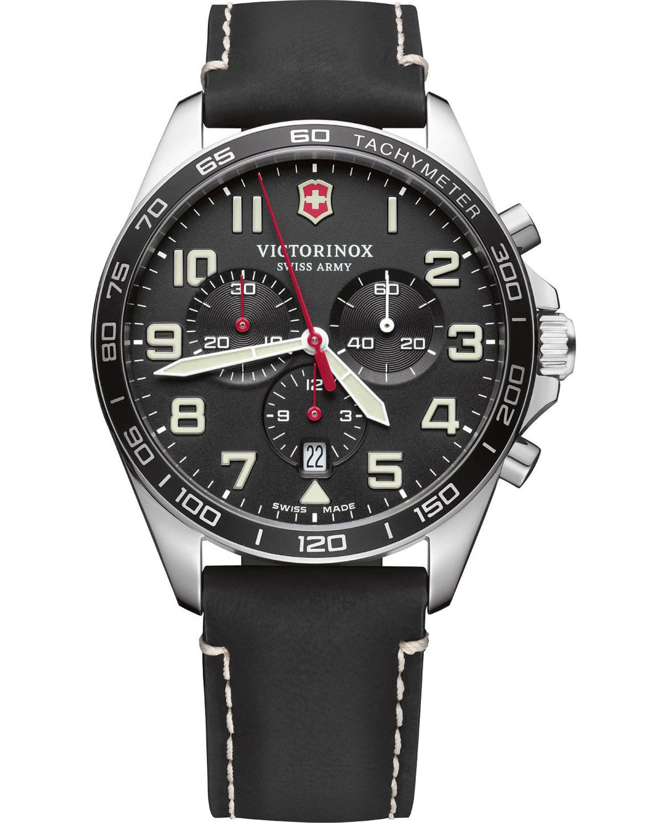 Мужские швейцарские часы-хронографХронографФункция позволяет измерять отрезки времени с особой точностью: часы, минуты, секунды. Верным признаком хронографа является наличие на циферблате 3 дополнительных окошек-счётчиков. Victorinox Fieldforce Chronograph 241852 с надёжным кварцевым механизмом. Сапфировое стеклоСапфировое стеклоПрочный и надёжный материал из кристалла сапфира синтетического происхождения, характеризующийся особой твёрдостью и устойчивостью к царапинам и повреждениям. с трёхслойным антибликовым покрытием. Корпус часов выполнен из стали с PVD-покрытиемPVDУльтратонкое покрытие наносится в технике вакуумного напыления, сочетает в себе нитрид титана особой прочности со слоем золота или оксида хрома. Несёт в себе декоративную или защитную функцию.. Практичный кожаный ремешок на стандартной застёжке. Влагозащита: 100 метров, позволит плавать, нырять и заниматься другими водными видами спорта. Окошко даты находится в положении 6 часов, стрелки и метки с люминесцентным покрытиемЛюминесцентное покрытиеПозволяет считывать показания времени в темноте. Производители наносят на стрелки, часовые индексы, безель или поверхность циферблата светонакопительный состав, дающий холодное свечение., тахиметрТахиметрРазмеченная шкала, располагается на ободке или безеле часов. Тахиметр позволяет рассчитать скорость на определённом участке пути, расстояние измеряется в километрах или милях..