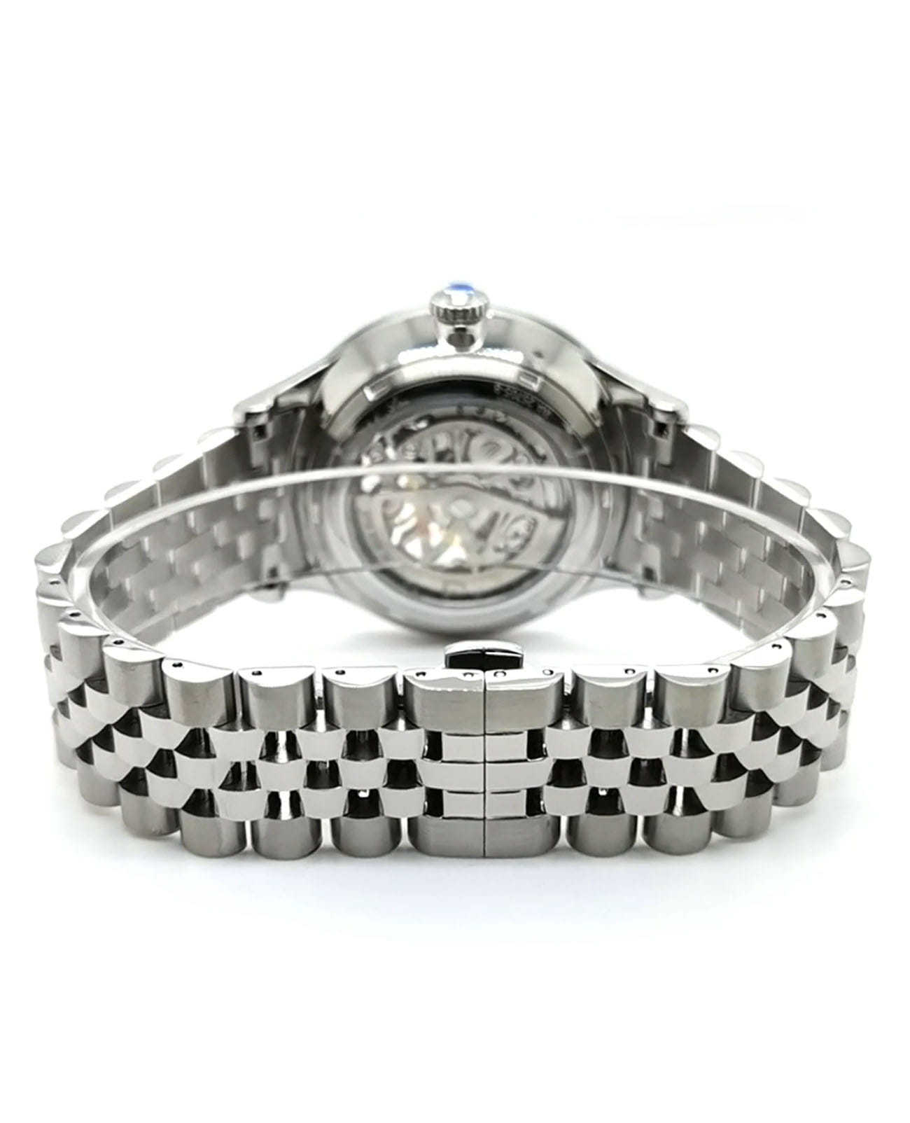 Механические часы-скелетоны Wainer WA.25705-B. Корпус и браслет выполнены из нержавеющей стали 316L. Сапфировое стеклоСапфировое стеклоПрочный и надёжный материал из кристалла сапфира синтетического происхождения, характеризующийся особой твёрдостью и устойчивостью к царапинам и повреждениям.. Водозащита: 50 метров, позволит защитить корпус от случайных брызг или капель дождя. Браслет на раскладной застёжкеРаскладная застёжкаТакой тип застёжки используется только на браслетах из металла. Она никогда не раскрывается полностью, происходит разделение на 2 и более частей. Раскладывающая застёжка снизит вероятность потери часов к минимуму..