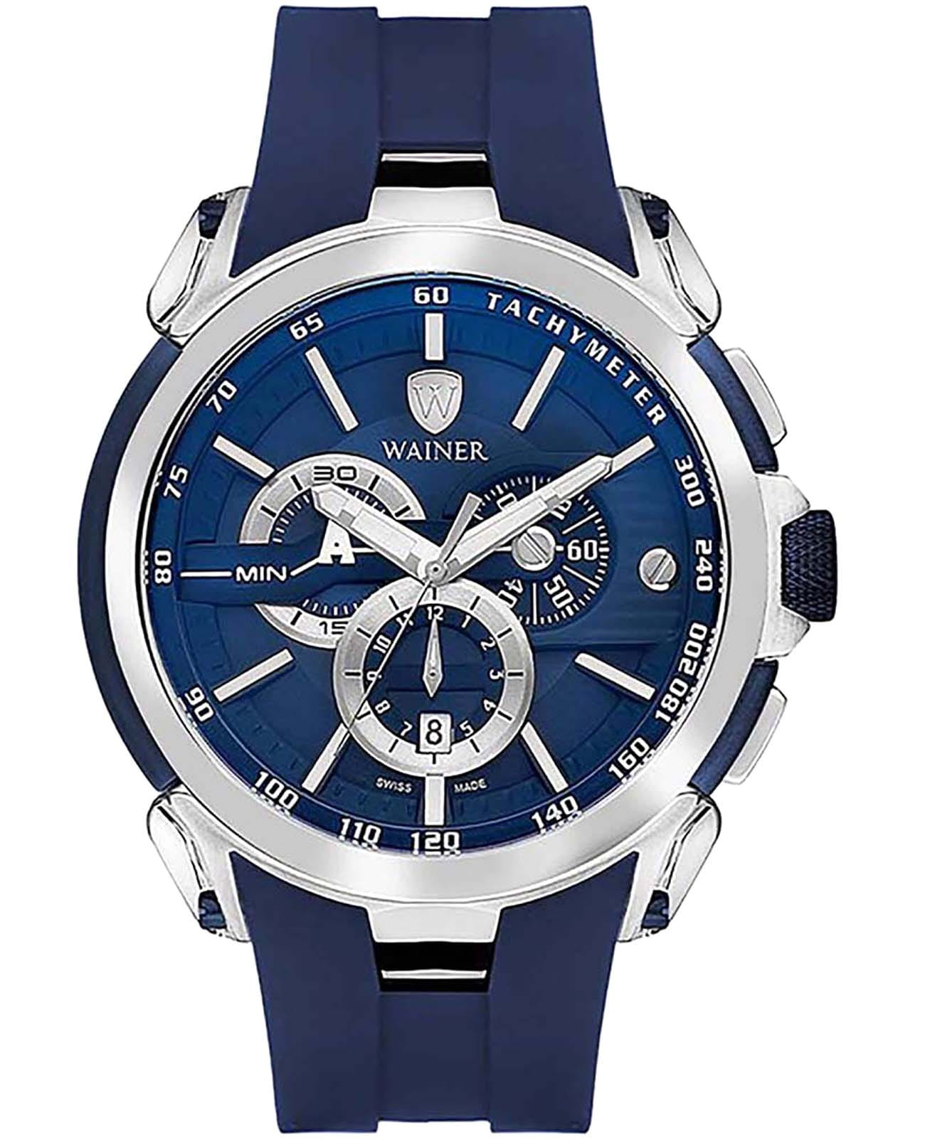 Мужские кварцевые часы-хронографХронографФункция позволяет измерять отрезки времени с особой точностью: часы, минуты, секунды. Верным признаком хронографа является наличие на циферблате 3 дополнительных окошек-счётчиков. с секундомеромСекундомерСекундоме́р — прибор, способный измерять интервалы времени с точностью до долей секунды. Wainer WA.16910-I сочетает элегантный дизайн и высокое качество исполнения. Корпус выполнен из нержавеющей стали с частичным PVD-покрытиемPVDУльтратонкое покрытие наносится в технике вакуумного напыления, сочетает в себе нитрид титана особой прочности со слоем золота или оксида хрома. Несёт в себе декоративную или защитную функцию., диаметром 47 мм и толщиной 12 мм, обеспечивает прочность и долговечность. Циферблат с метками в виде штрихов выполнен по технологии Sunray (солнечные лучи) и украшен фирменным логотипом Wainer и дополнен тахиметромТахиметрРазмеченная шкала, располагается на ободке или безеле часов. Тахиметр позволяет рассчитать скорость на определённом участке пути, расстояние измеряется в километрах или милях.. Сапфировое стеклоСапфировое стеклоПрочный и надёжный материал из кристалла сапфира синтетического происхождения, характеризующийся особой твёрдостью и устойчивостью к царапинам и повреждениям. защищает дисплей от царапин и механических повреждений. Окошко даты находится в положении 6 часов. Стрелки с люминесцентным покрытиемЛюминесцентное покрытиеПозволяет считывать показания времени в темноте. Производители наносят на стрелки, часовые индексы, безель или поверхность циферблата светонакопительный состав, дающий холодное свечение., улучшая читаемость в условиях недостаточного освещения. Силиконовый ремешок на стандартной застёжке обеспечивает комфортное ношение. Водонепроницаемость до 100 метров делает модель подходящей для плавания и активного образа жизни. Wainer — это стильный и надежный аксессуар для тех, кто ценит швейцарское качество и современные технологии.