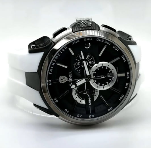 Швейцарские мужские кварцевые часы-хронограф Wainer Trio WA.16910-L с механизмом калибра Ronda 5030 созданы для любителей современного спортивного стиля. Часы оснащены широким набором функций, включая секундомер, тахиметр и вынесенную секундную стрелку. Круглый корпус из нержавеющей стали 316L с частичным PVD-покрытиемPVDУльтратонкое покрытие наносится в технике вакуумного напыления, сочетает в себе нитрид титана особой прочности со слоем золота или оксида хрома. Несёт в себе декоративную или защитную функцию. диаметром 47 мм и толщиной 13 мм защищен прочным сапфировым стекломСапфировое стеклоПрочный и надёжный материал из кристалла сапфира синтетического происхождения, характеризующийся особой твёрдостью и устойчивостью к царапинам и повреждениям.. Черный циферблат с метками в виде штрихов оснащен окошком даты в положении 6 часов. Стрелки с люминесцентным покрытиемЛюминесцентное покрытиеПозволяет считывать показания времени в темноте. Производители наносят на стрелки, часовые индексы, безель или поверхность циферблата светонакопительный состав, дающий холодное свечение. обеспечивают хорошую видимость в темное время суток. Рифленая заводная головка с защитой добавляет надежности модели. Часы имеют класс водозащиты 100 метров, позволит плавать, нырять и заниматься другими водными видами спорта. Модель комплектуется удобным силиконовым ремешком шириной 24 мм на стандартной застежке. Вес часов составляет 140 грамм, что обеспечивает комфортное ношение в течение дня.