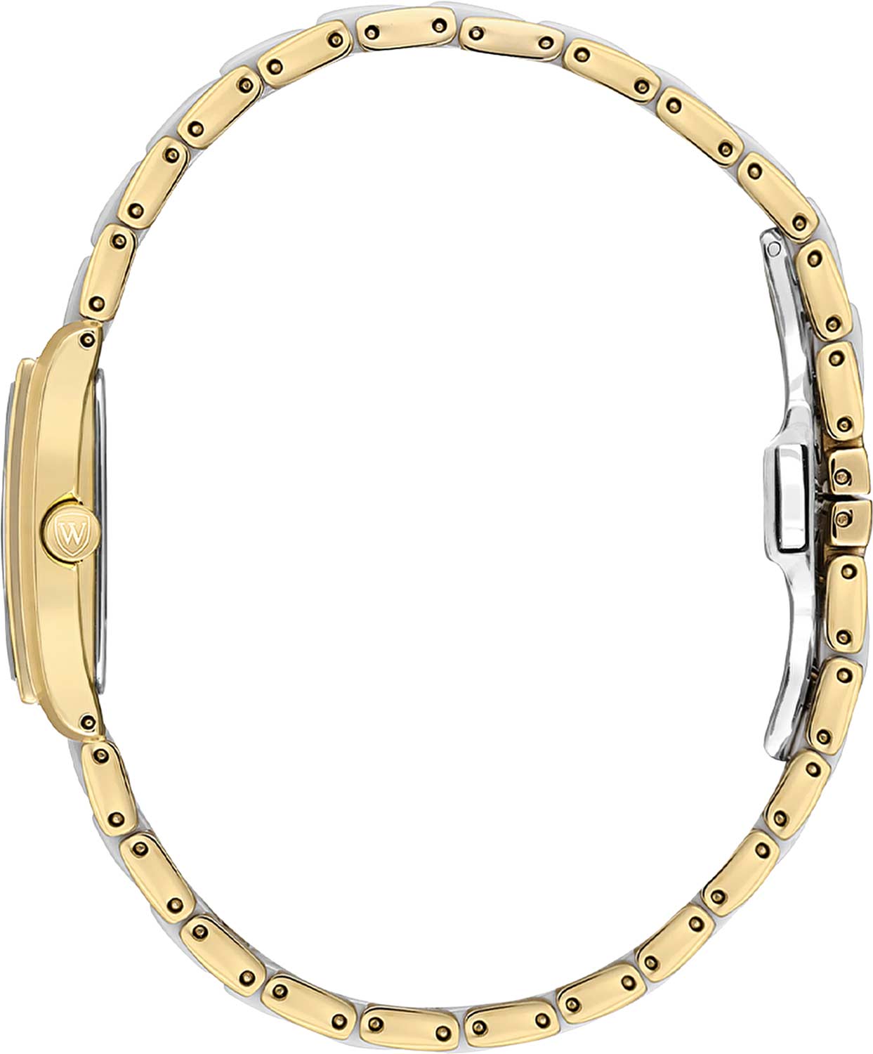 Швейцарские женские кварцевые часы Wainer WA.18060-G станут элегантным дополнением любого образа. Прямоугольный корпус из нержавеющей стали 316L размером 22х24.5 мм и толщиной 8 мм защищен прочным сапфировым стекломСапфировое стеклоПрочный и надёжный материал из кристалла сапфира синтетического происхождения, характеризующийся особой твёрдостью и устойчивостью к царапинам и повреждениям.. Циферблат с метками в виде штрихов украшен кристаллом в положении 12 часов, а заводная головка с фирменным логотипом добавляет модели особый шарм. Часы имеют класс водозащиты 30 метров, позволит защитить корпус от случайных брызг или капель дождя. Модель комплектуется стальным браслетом из нержавеющей стали 316L с керамическими вставками на раскладной застёжкеРаскладная застёжкаТакой тип застёжки используется только на браслетах из металла. Она никогда не раскрывается полностью, происходит разделение на 2 и более частей. Раскладывающая застёжка снизит вероятность потери часов к минимуму., длина браслета составляет 180 мм. Вес часов 88 грамм обеспечивает комфортное ношение в течение дня. Элегантный дизайн и надежное качество швейцарского производства делают эти часы превосходным выбором для современной женщины.